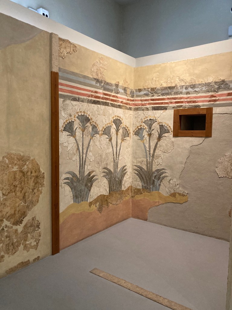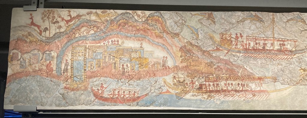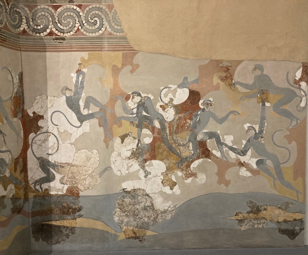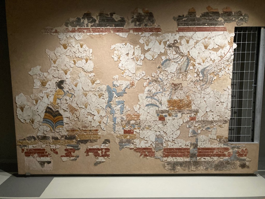 Below are some photos from my visit to the Museum of Prehistoric Thera. They may give you some sense of the rich wall paintings left behind after the settlement at Akrotiri that certainly was destroyed by the volcanic eruption around 1600.